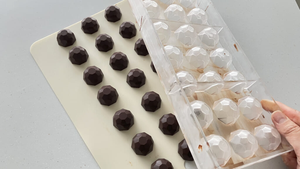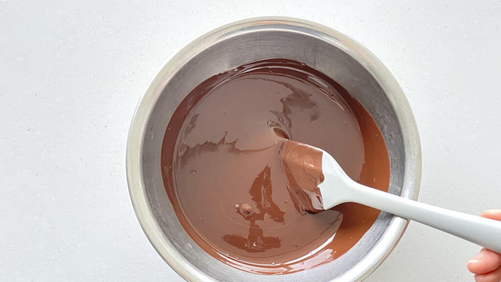 1.チョコレートを湯せんでなめらかに溶かし、45~50度にする(ミルク、ホワイトなら40~42度)。