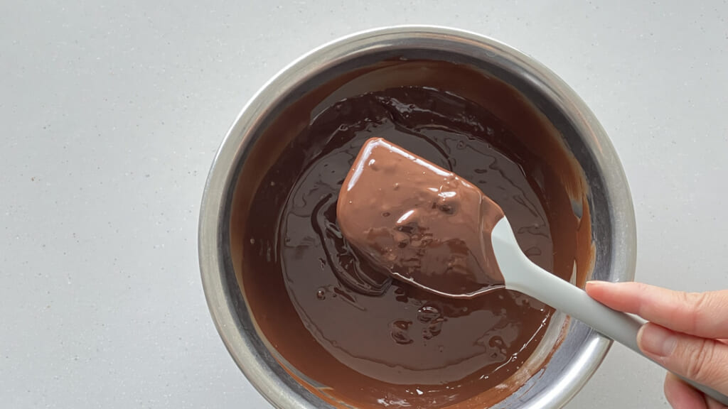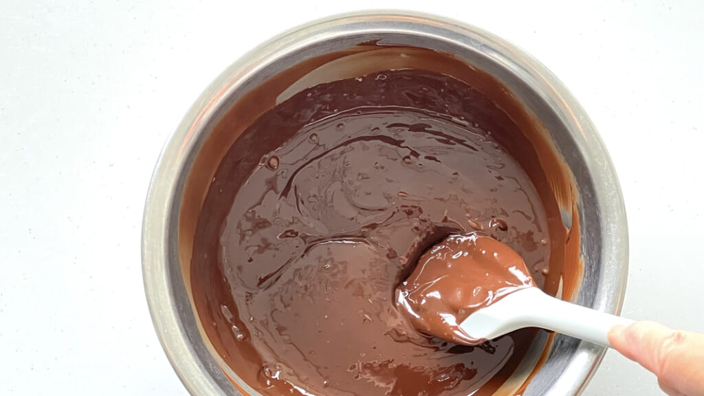 今度は温度を上げすぎないように、少し湯せんにあてたらすぐ湯せんからはずし、全体を混ぜてチョコレートを溶かしていく。再び湯せんにあて、を繰り返し、やっとチョコレートのダマがなくなりなめらかになったところで完成。温度は30.5~31度(ホワイト、ミルクなら28~29度)。もし温度を上げ過ぎてしまったら、もう1度湯せんにあてて1の温度まで上げるところからやり直す
