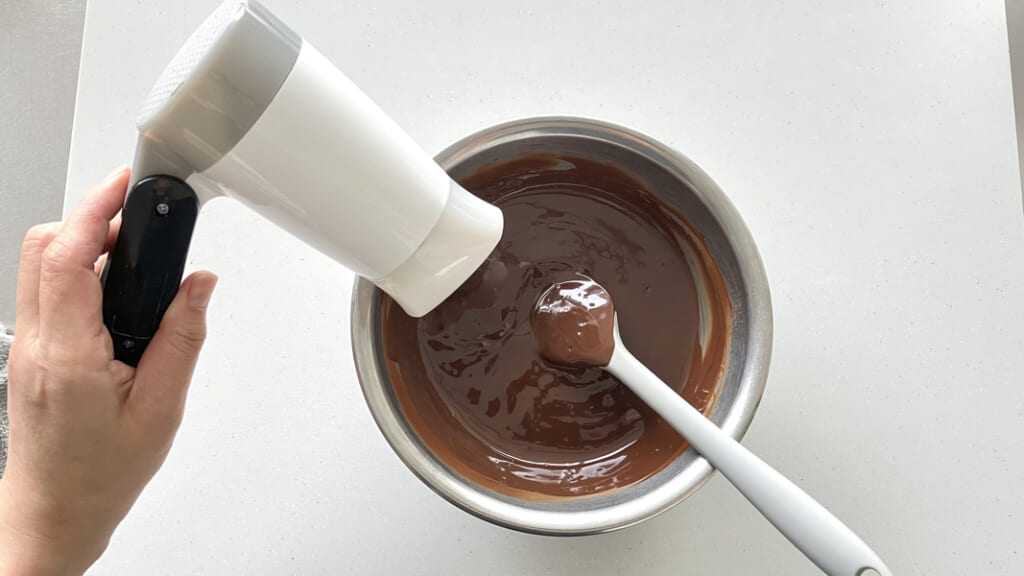 作業中もチョコレートが固まってきてドロッとしてくると作業がしにくくなります。その時はドライヤーでさっと固まってきた部分やチョコレートの上面を温め、全体をよく混ぜてから作業に戻りましょう。ただし全体を混ぜたところでプロセス3の完成温度(ビター、スイートは30.5~31度まで、ホワイト、ミルクなら28~29度まで)を超えてしまうとテンパリングが壊れてしまうので、温めすぎには注意しましょう。