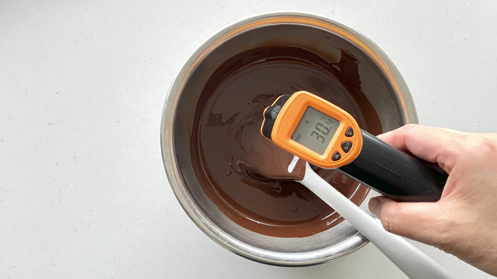 そして固まらない、収縮しない、艶が悪いなど、テンパリングが失敗しているような症状が出たら、もう一度やり直せば問題ありません。もう一度プロセス1.の「温かい状態(45度程度)にする」~やり直しましょう。プロセス2.の氷水で冷やす、ところではなく、もう一度温度をさらに上げるところからです。