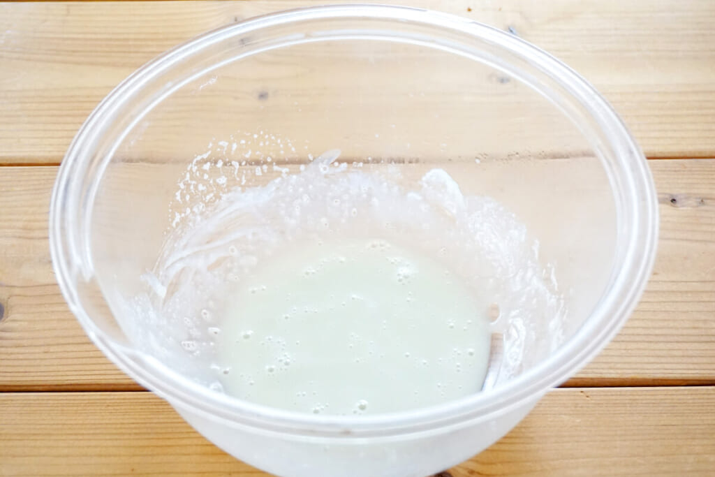 仕上がりの目安は水っぽさ(分離)がなくなり、線を描くとふわっと戻ってくる程度です。