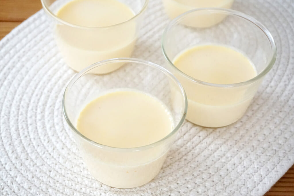 湯せんにかけて弱火で20~25分。軽くゆすって波打つ程度になったら取り出して冷まします。