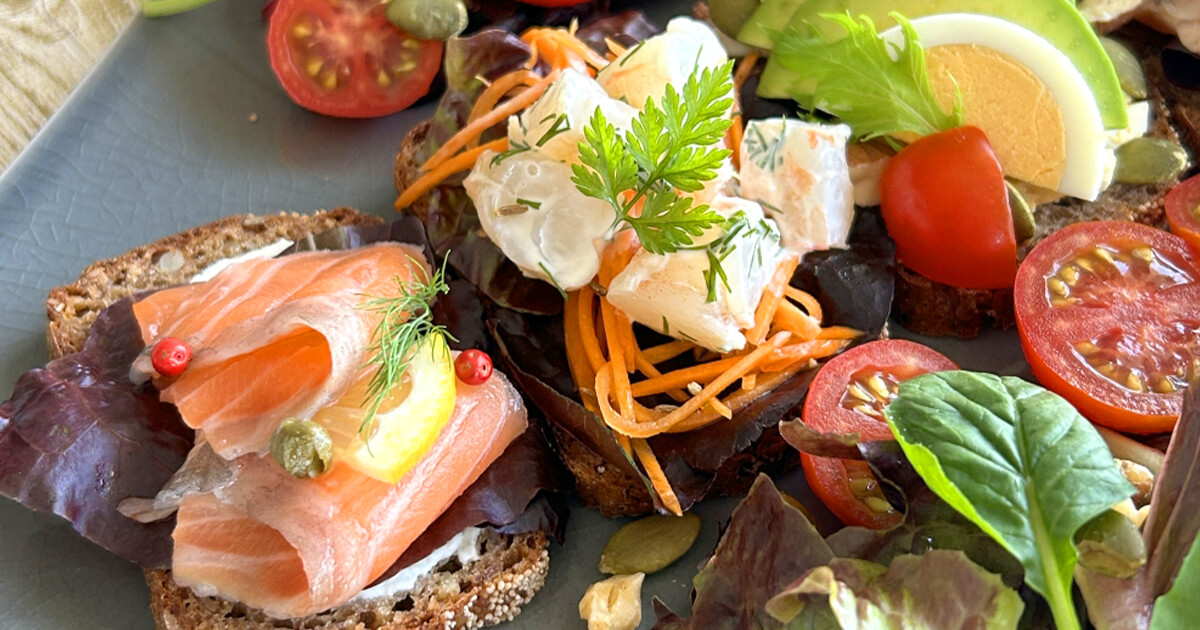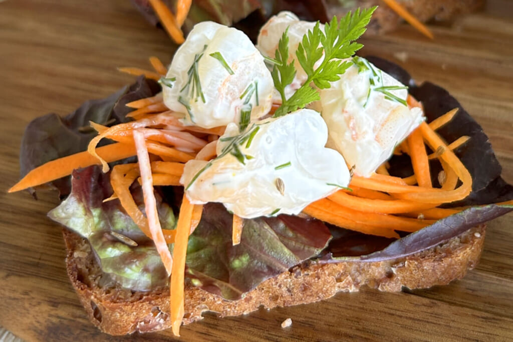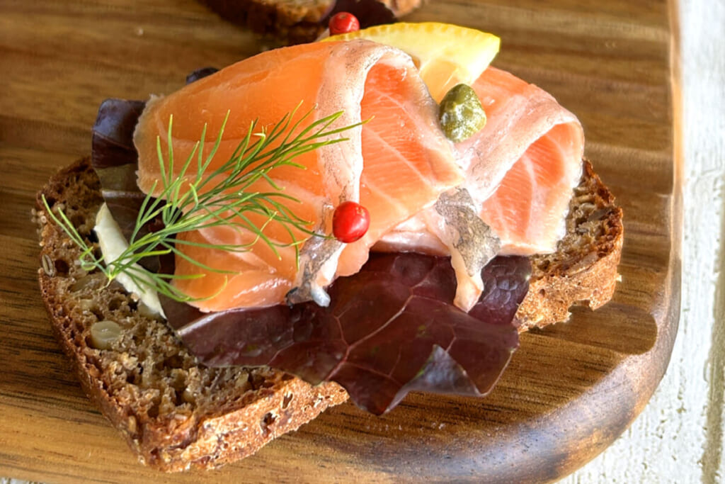 フレッシュなうちはバターを塗るだけでも美味しく、水分が抜けてきたら、それを補うようにサワークリームやタルタルソースなどを塗ってサーモンや野菜などをのせていただく「スモーブロ」に仕立てて食べるのがデンマーク流。