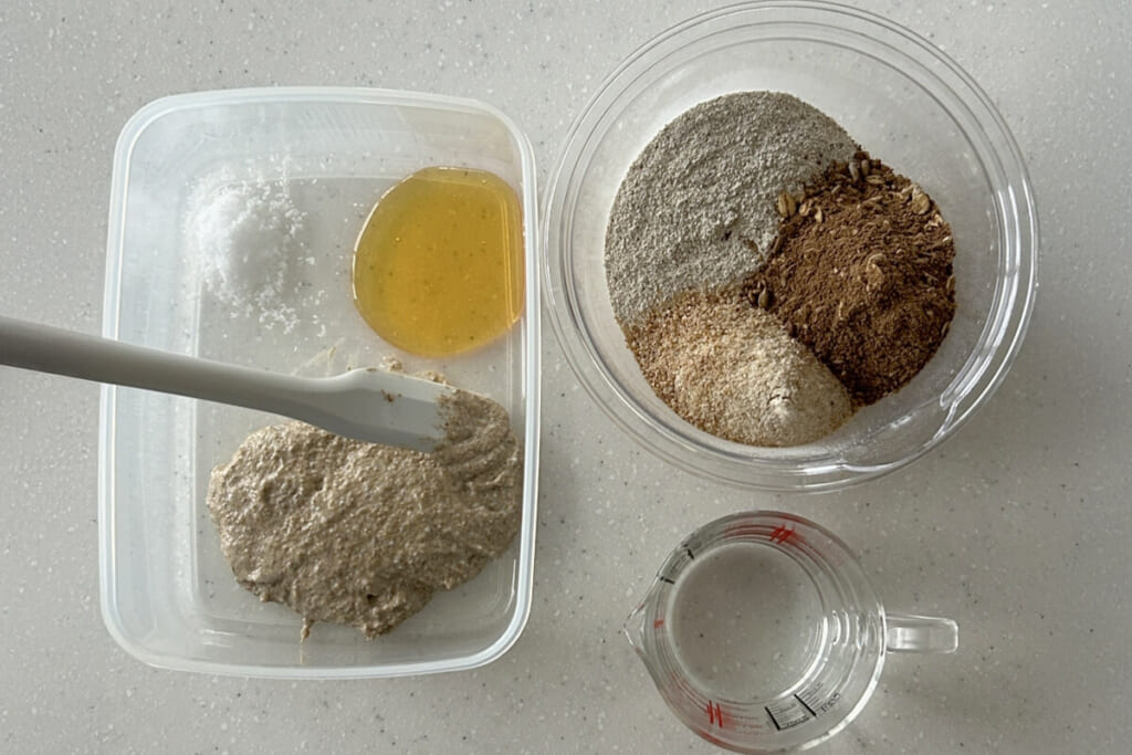 材料を計量する。蓋付き保存容器にサワー種、蜂蜜、塩を入れる。