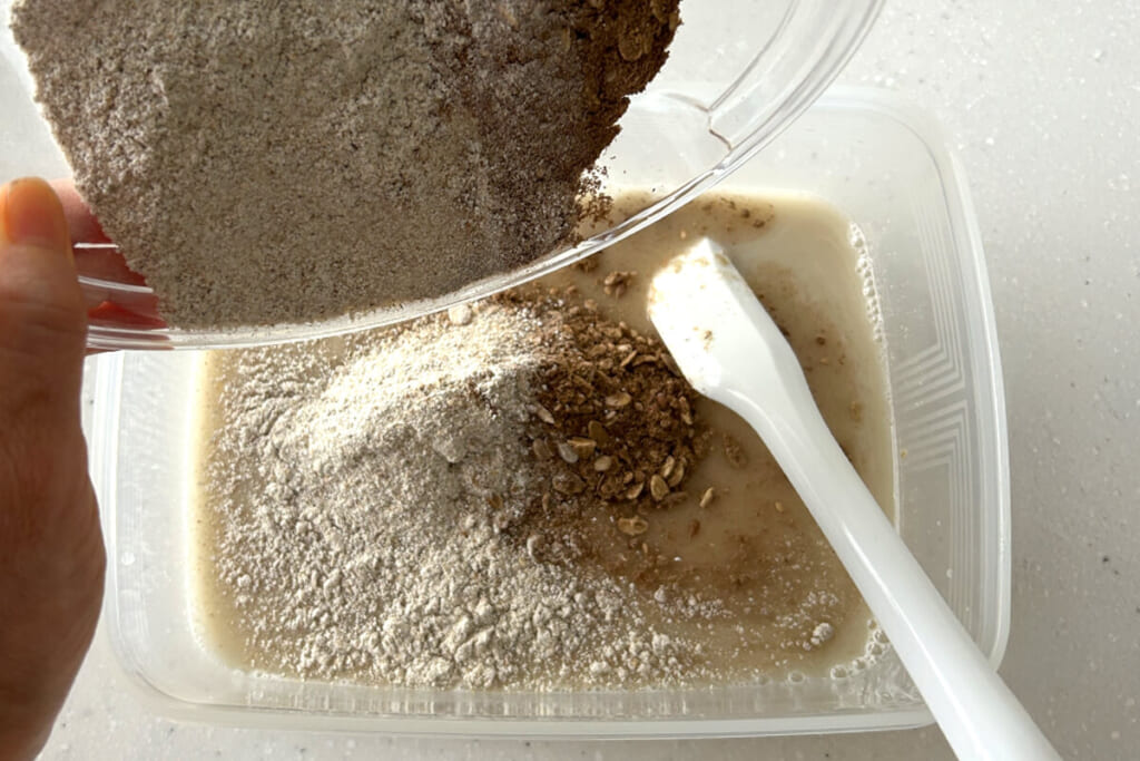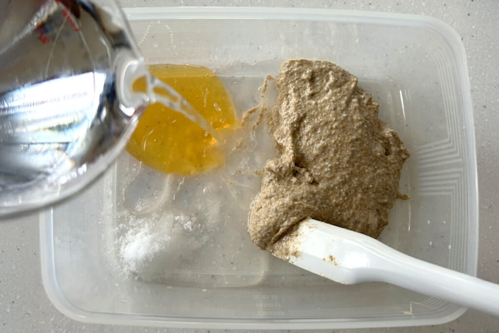 2.水を全て注ぎ入れ、蜂蜜、塩を溶かしながら、サワー種をほぐすようにして全体を混ぜ合わせる。