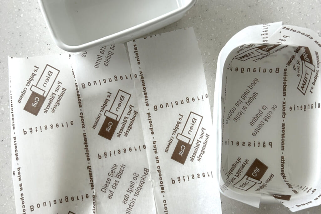 型の大きさに合わせてベーキングペーパーをカットし、型の内側に敷く。