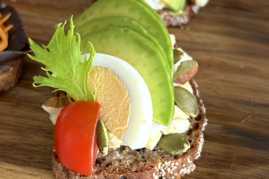 - ルブロにタルタルソースをのせ、薄切りしたアボカド、ゆで卵、プチトマトをのせる。