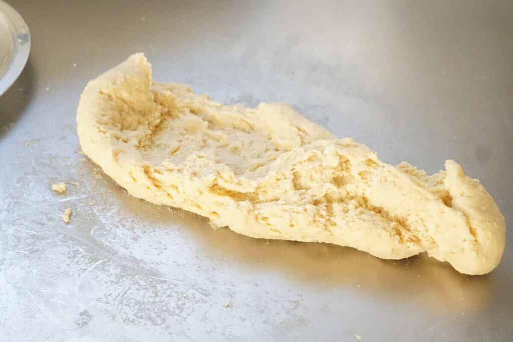 捏ねた生地にバターは少量ずつ馴染ませていきますが、最初は生地が伸びにくいです。