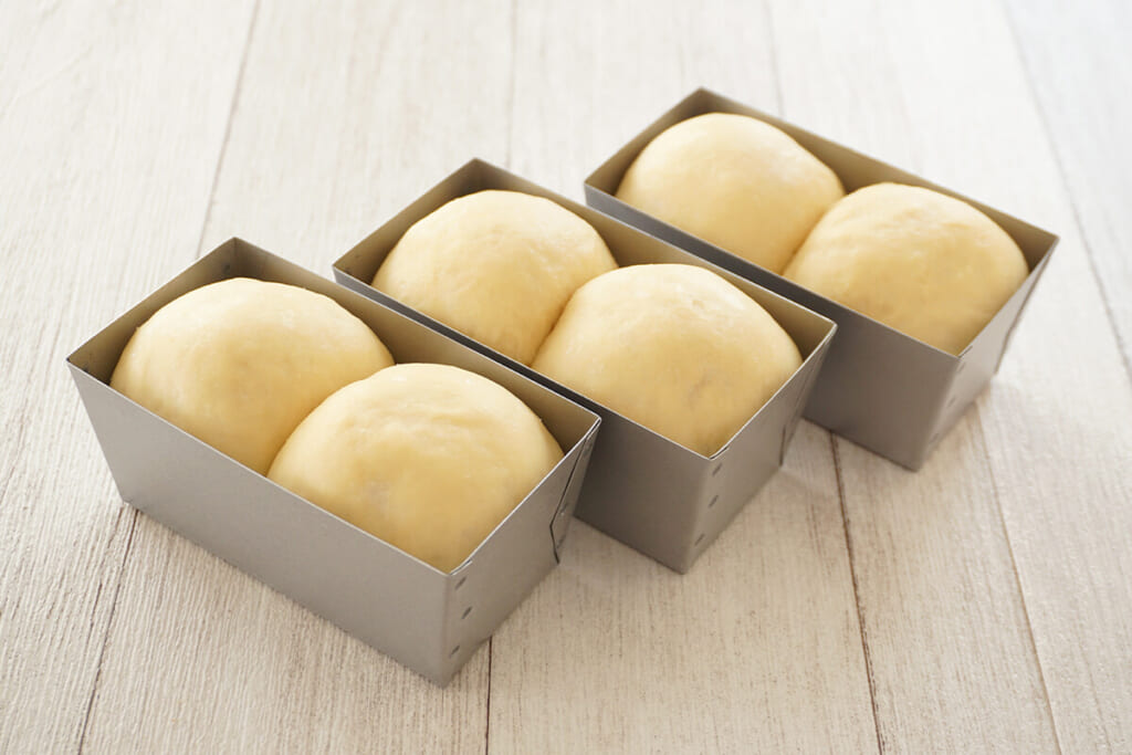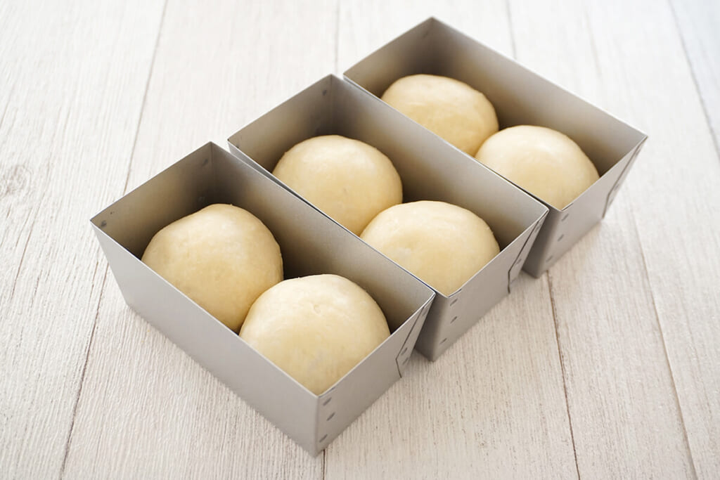 ベンチタイムを終えたら再度丸め直し(成形)、ミニパウンド型に2つずついれます。