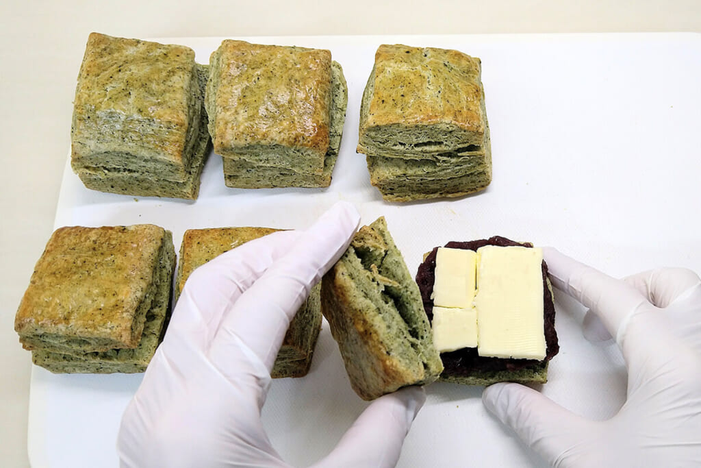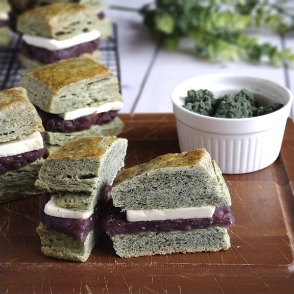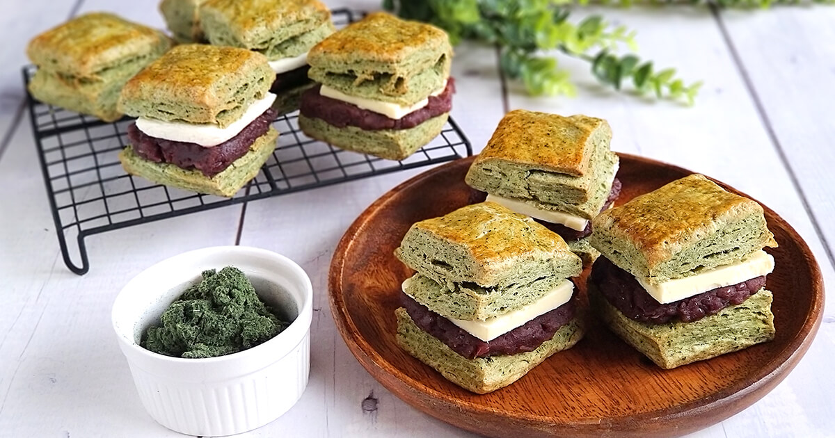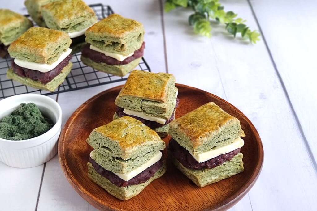 富澤商店のレシピ「よもぎ香るあんサンドスコーン」を参考に「よもぎスコーンの餡バターサンド&餡クリチサンド」を作ってみました。