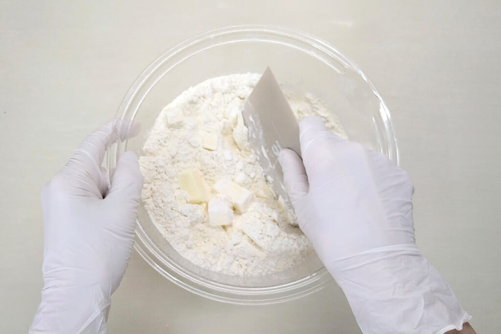 ①粉類にバターを加えてカードで切るようにして混ぜる。