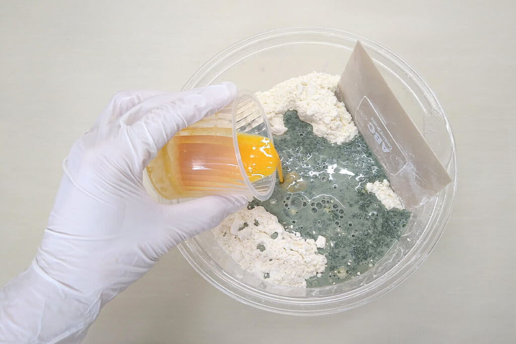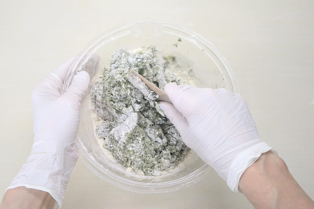 ②準備しておいたよもぎを入れた牛乳、卵を加えて粉気がなくなるまで混ぜる。