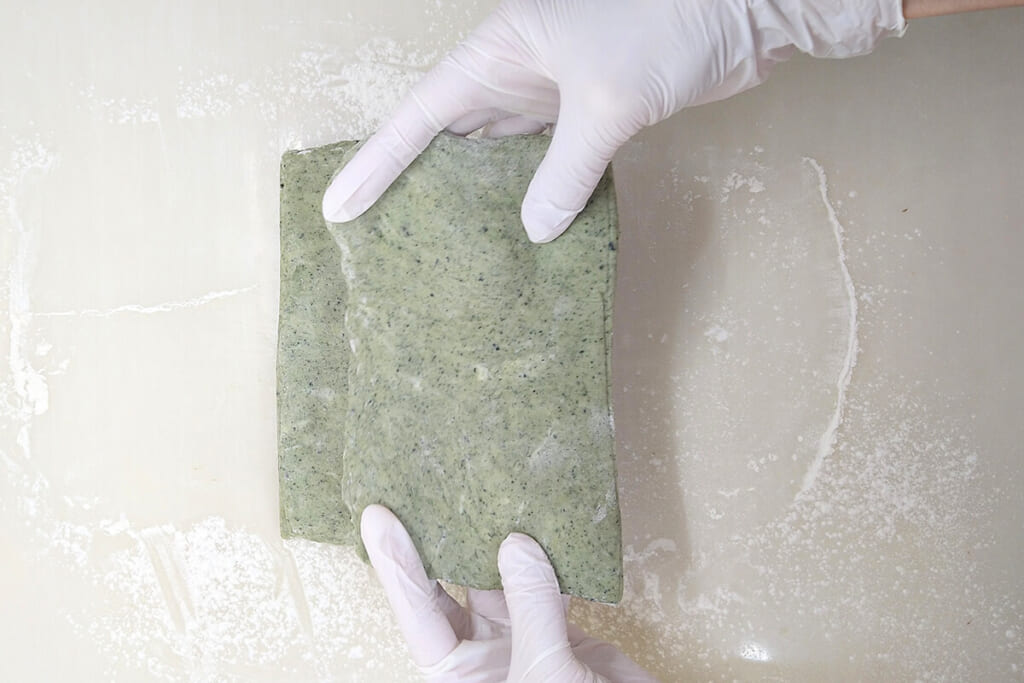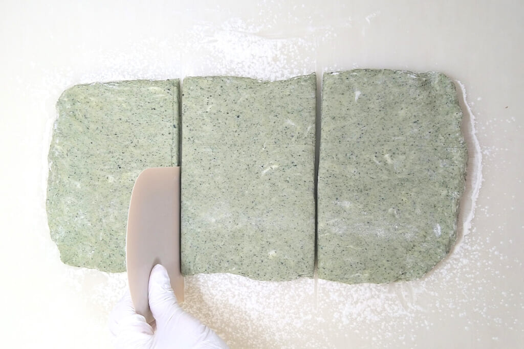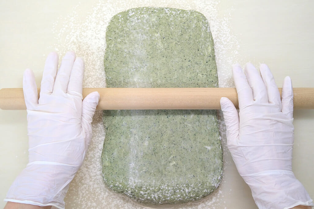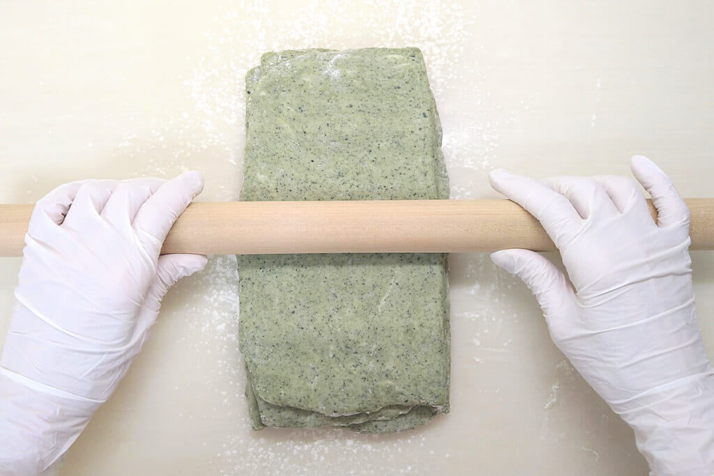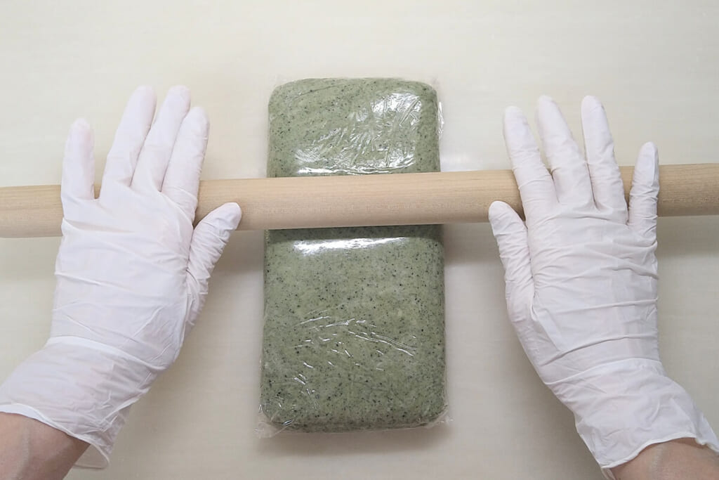 ⑦生地を22×12㎝にのばし、ラップに包んで冷蔵庫で1 時間休ませる。