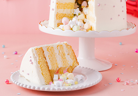 中からマシュマロやラムネなどのお菓子が出てくるサプライズケーキは、カットした時に盛り上がること間違いなし!