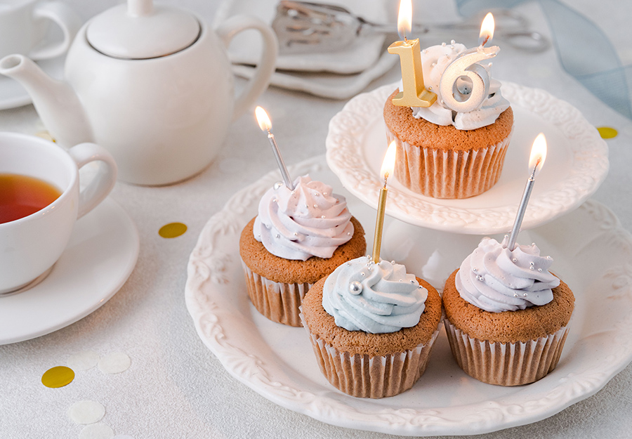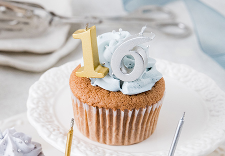 カップケーキをゴールドやシルバーのキャンドルで飾れば、品の良いお誕生日ケーキに。記念日にもおすすめです。