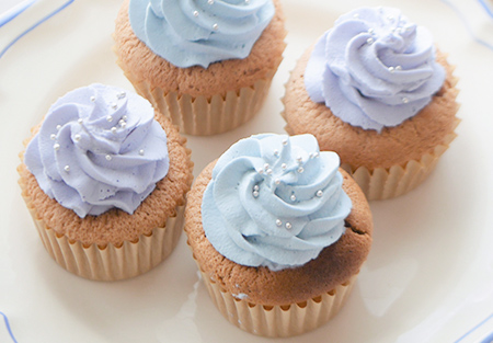 鮮やかですが、実は着色料不使用のカップケーキです。バタフライピーパウダーで青くしています。