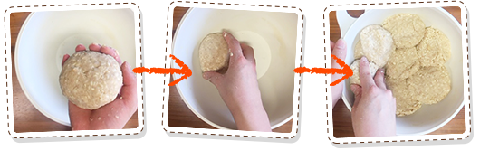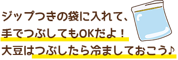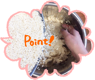 そうそう!冷めた大豆と一緒にして、 手でしっかり混ぜ合わせるの!