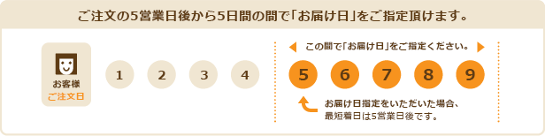 ご注文日から起算して5営業日後から5日間の期間でご指定いただけます。ご注文時にご指定下さい。