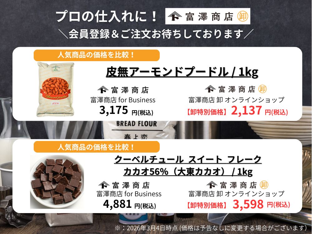 法人・個人事業主様のおトクな仕入れには、「富澤商店 卸 オンラインショップ」をご利用くださいませ。