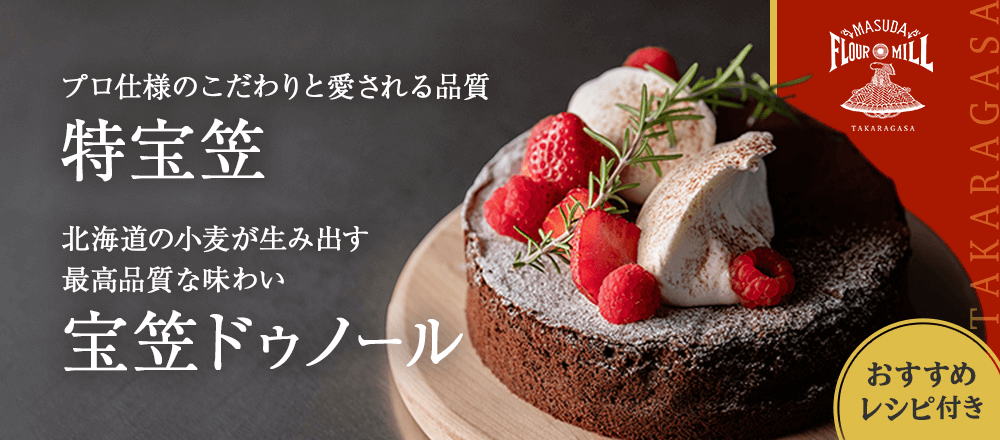 宝笠ドゥノールとは、北海道産小麦にこだわり、もちもちとした適度な弾力が特長の製菓用小麦粉。