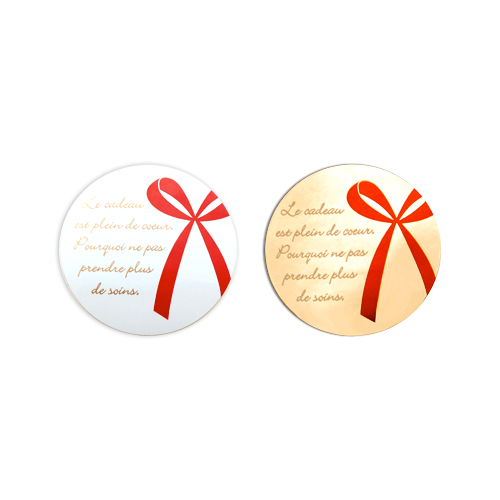 赤いリボンのイラストに英文字入りのおしゃれなシール。袋の口を留めたり、箱に貼るなど、ラッピングのポイントとしてお使いください。