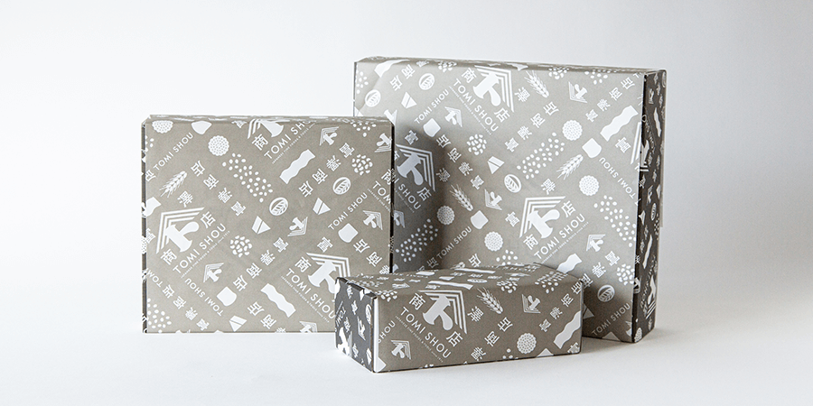 掛け紙は店舗でも使用している総柄の包装紙で、ギフトボックスと共通のデザイン。