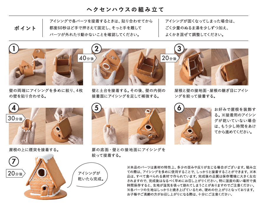 <セット内容>●ヘクセンハウスの組立パーツ…9点(土台/正面壁/背面壁/側面壁×2/屋根×2/煙突/扉) ●粉ゼラチン(1g)+粉砂糖(120g)…2セット(1セット予備分) ●絞り袋…4枚