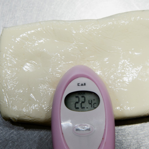 クリームチーズは1cmくらいの厚さの長方形にカットし、ラップで包んでレンジにかけて22~25℃にする。