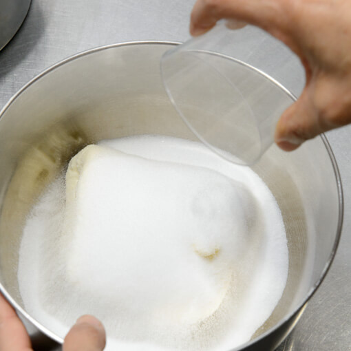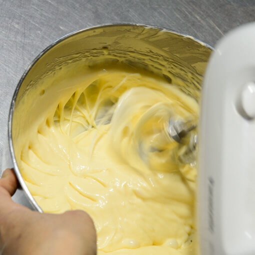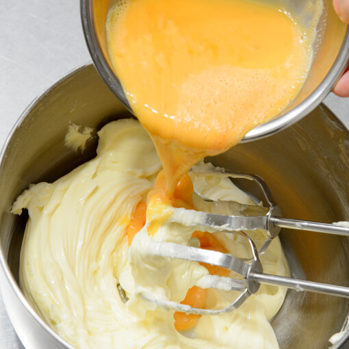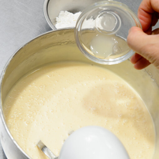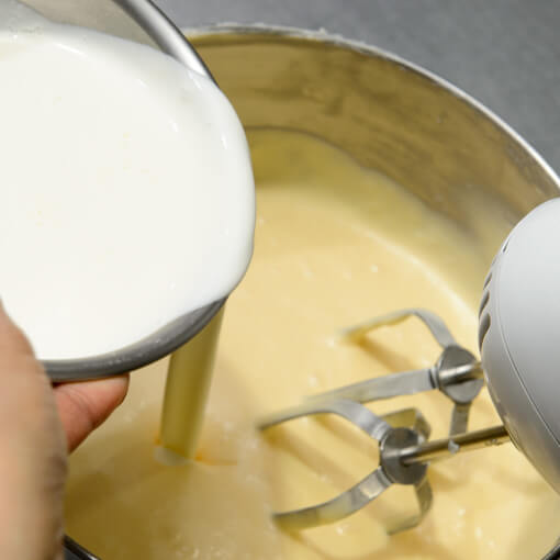 4の卵液を2~3回に分けて加え、ハンドミキサーで混ぜる。*材料を加えていくときは、その都度、ボウルの内側をゴムベラではらってきれいにしておくと、材料をむらなく混ぜ合わせることができます。