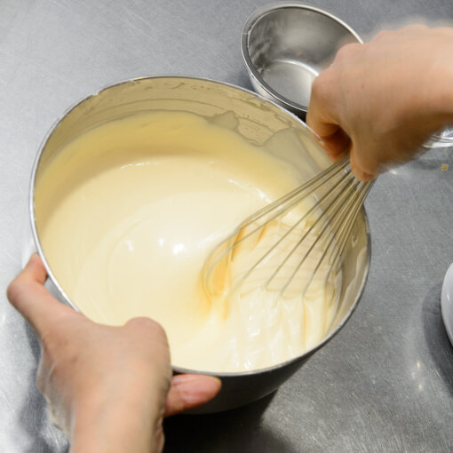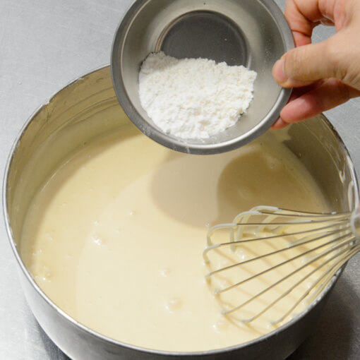 ホイッパーにもちかえて、ふるっておいた粉を加え、しっかり混ぜる。