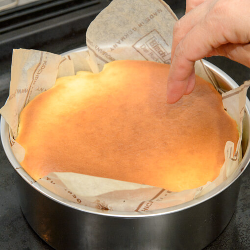 220℃のオーブンで20~23分焼く。上面に焦げ色がついたら焼き上がり。*焼き上がりの生地はふにゃふにゃと柔らかく、2~3cm程度膨らんでいる状態です。冷めると元の生地の状態まで沈みます。