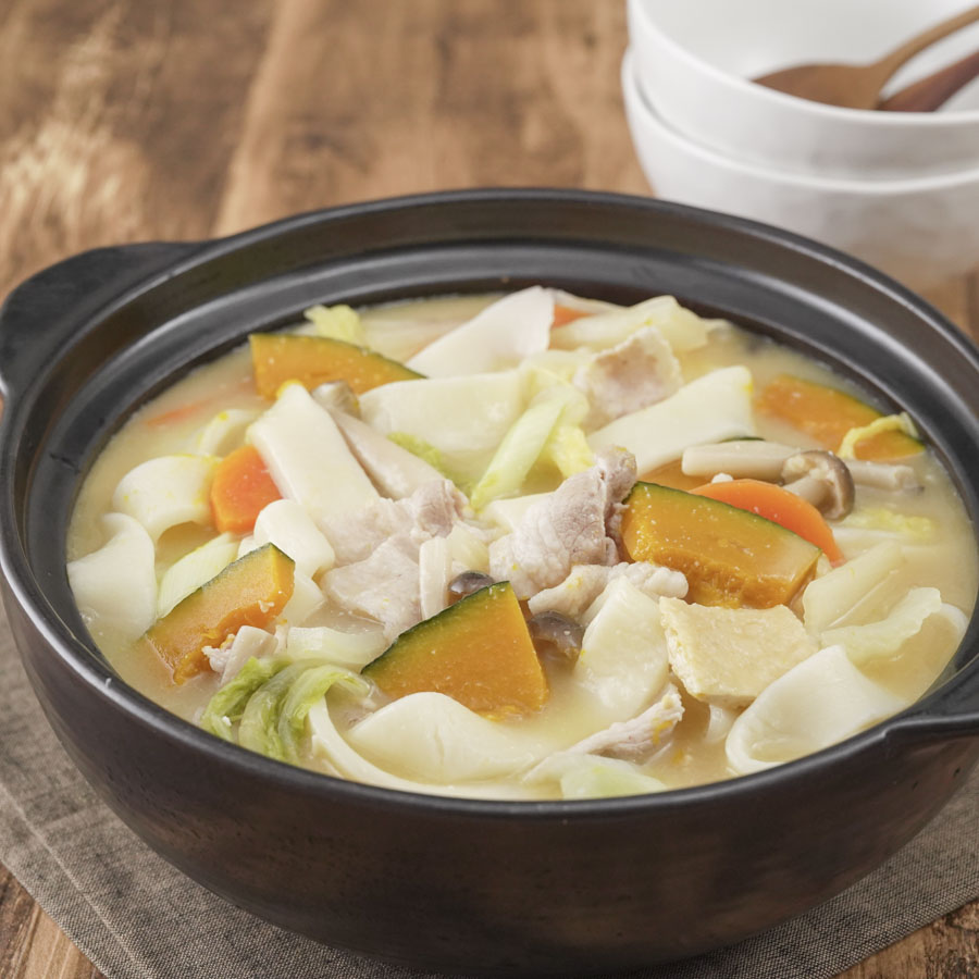 だしパックを沸騰したお湯に入れだしをとり、切った具材(肉・かぼちゃ・しめじなどお好みで)を加えたあと、かぼちゃが煮崩れるまで20分ほど煮込む。うどんを加えて一緒に煮込み、切ったネギを入れてほどよいところで火を止める。