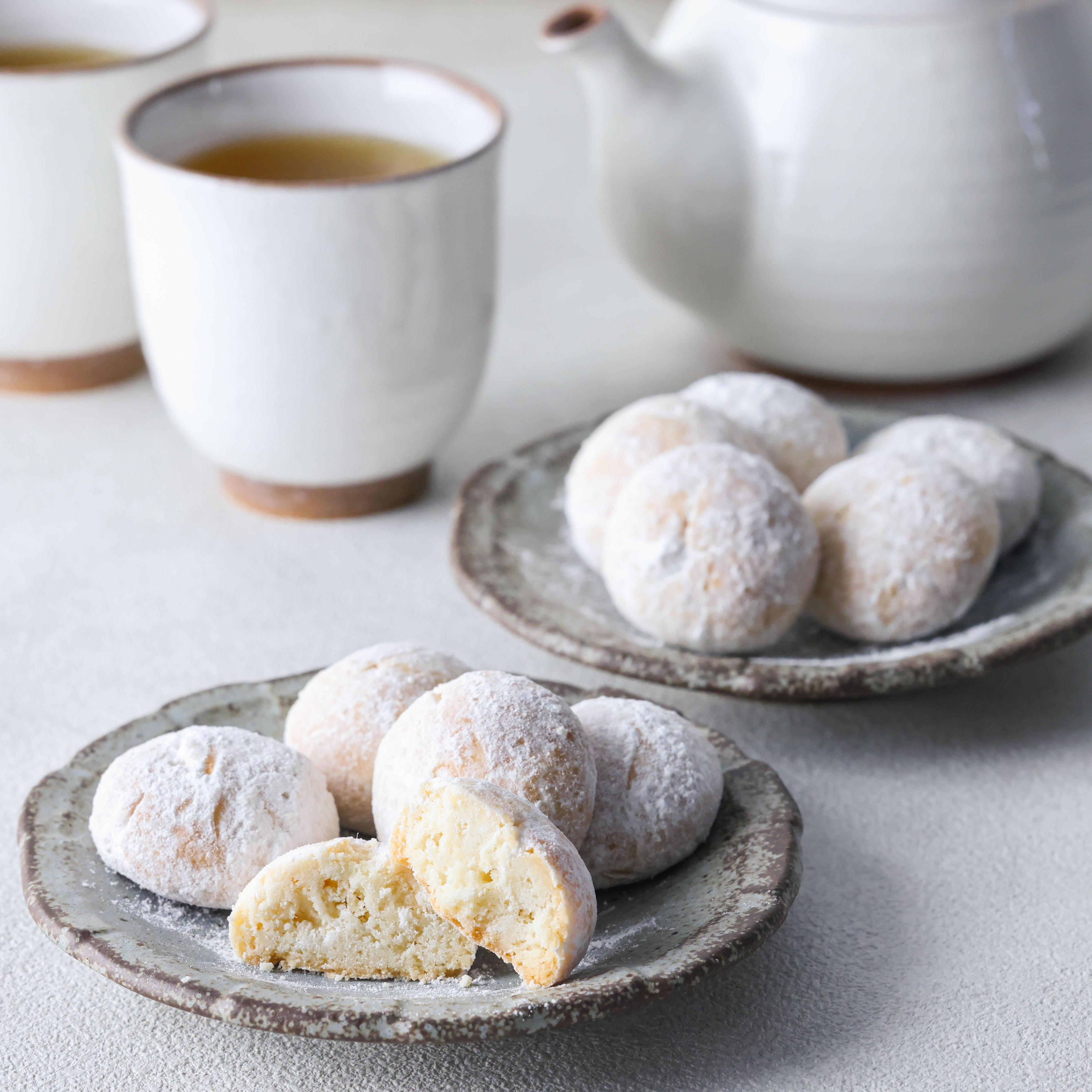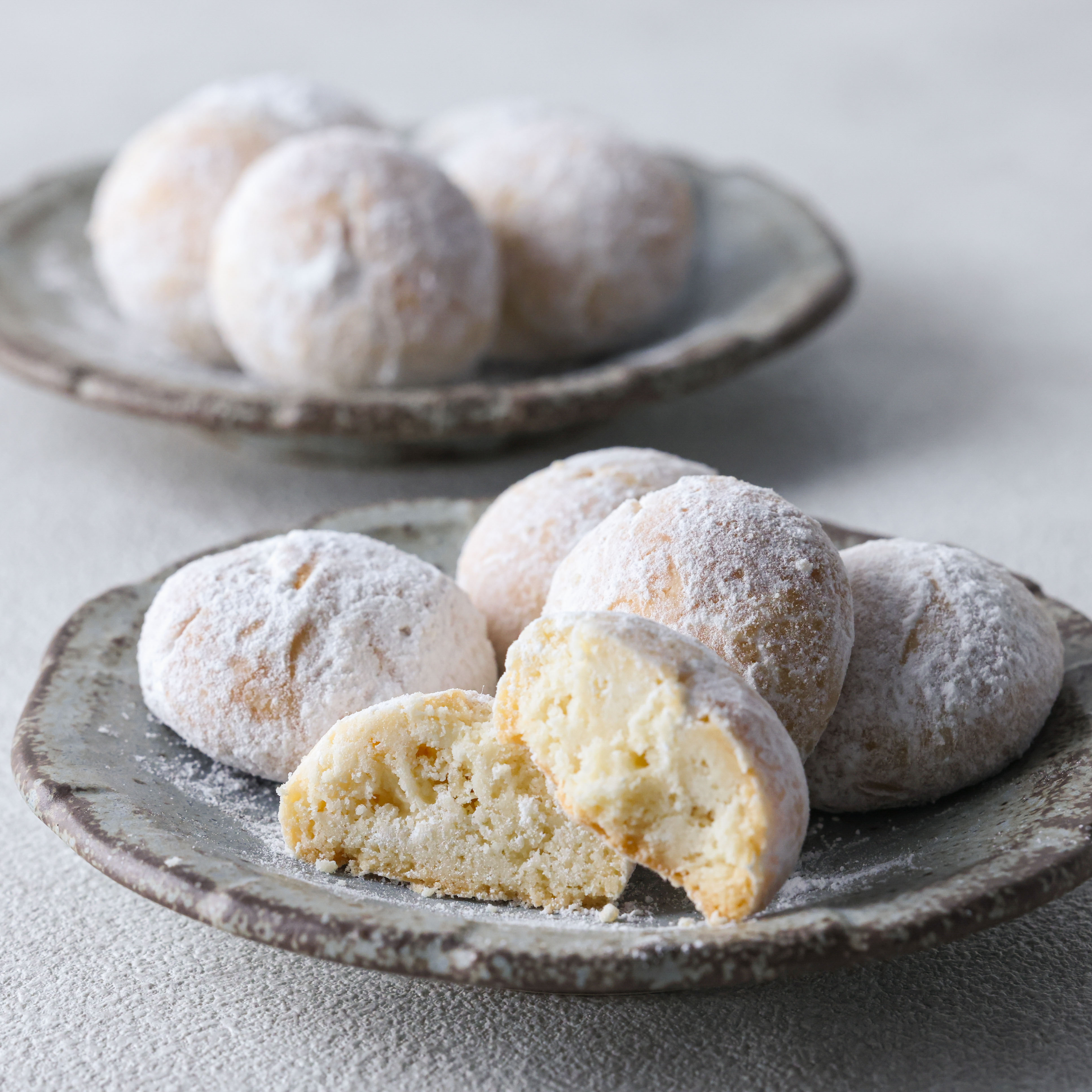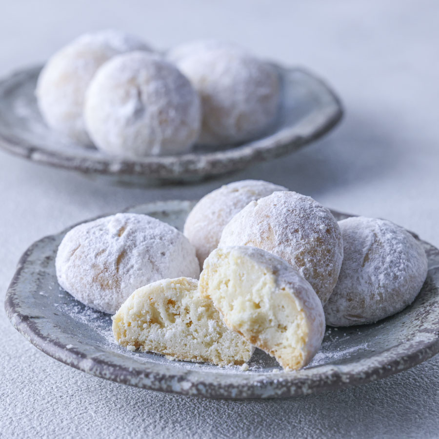 ブールドネージュは、「雪の玉」を意味するフランス語。英語では「スノーボールクッキー」なんて呼んだりもしますね。今回は材料に和三盆を使い、ホロホロとしたはかない口どけをより繊細に仕上げました。とても簡単なのに、ホッと安心してしまう味です。