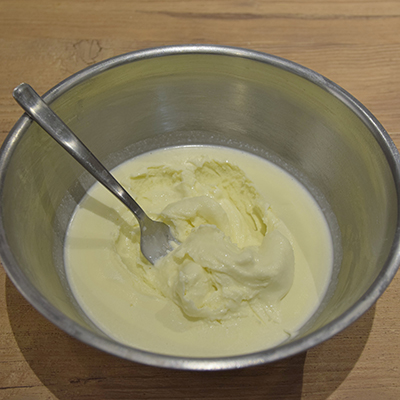 いったん取り出してフォークなどで空気を含ませるように混ぜ、再び冷凍庫へ入れます。