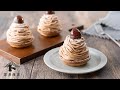 モンブラン口金中を入れた絞り袋にマロンクリームを入れ、(14)の土台の生クリームに巻きつけながら、下から上へ向かって絞る。冷蔵庫で1時間程休ませる。