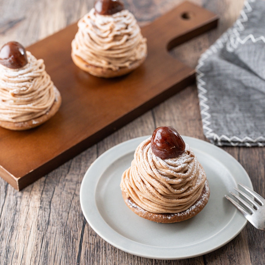 香ばしいさくさくのタルトにフランス・サバトン社のマロンペーストを使用し手作った濃厚なマロンクリームを絞ったモンブラン。1粒丸ごと入れた粒栗がアクセント。お店に負けない満足感のある味わいの栗のおいしさが存分に味わえるモンブランです。