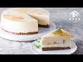 (8)のキャラメルムースを(15)の中央に入れて、軽く押してなじませる。 残りの洋梨ムースを入れて、全体に広げる。 上面を中央から外側に向けてパレットナイフですり切るようにしてならし、冷蔵庫で半日以上冷やし固める。