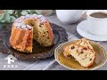 型の底(焼成後は山の頂上にあたる部分)にアーモンドを敷き、洋酒漬けにしたレーズンを加えたブリオッシュのような生地を入れて作るのが伝統的です。