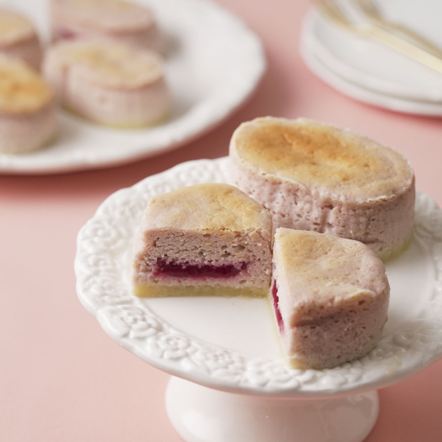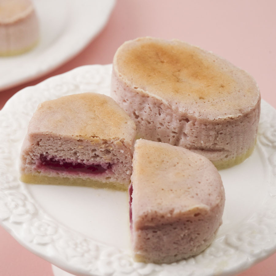 ラズベリーソースの入った、ほんのりピンク色のプチチーズスフレをふんわりと焼き上げました。生地にもラズベリーを使っているので、甘酸っぱい味が口の中で広がります。