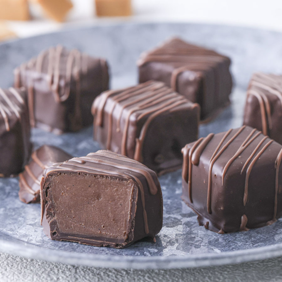 塩気のあるキャラメルがセンターのボンボンショコラ。 きちんとテンパリングを施したチョコレートはなめらかでつややか、うっとりするような仕上がりです。 選び抜いた素材と本格的な道具でつくるショコラティエのレシピ、特別な日のために挑戦してみてはいかがでしょうか。