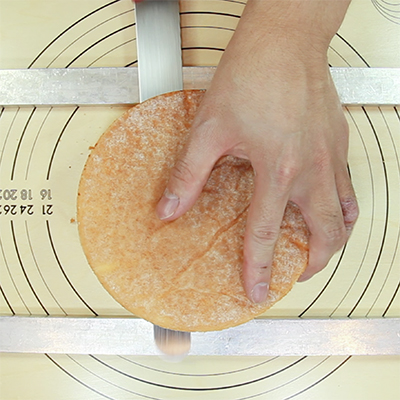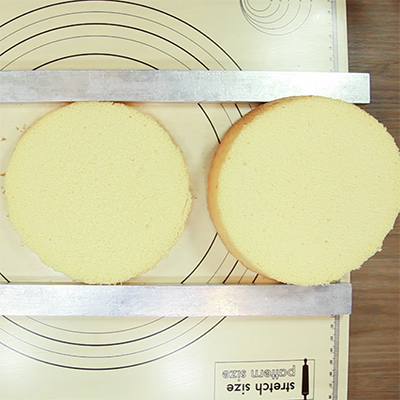 焼き面を切り落とし、スポンジを1.5㎝の厚さで2枚スライスします。 アクリルルーラー(5㎜と10㎜)を重ねて使うと、高さが安定してきれいに切れます。