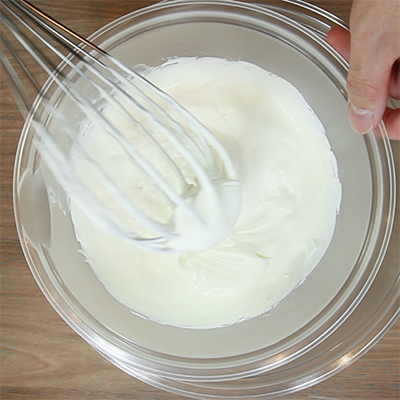ボウルに生クリームとグラニュー糖を入れてハンドミキサーで8分立まで泡だてます。