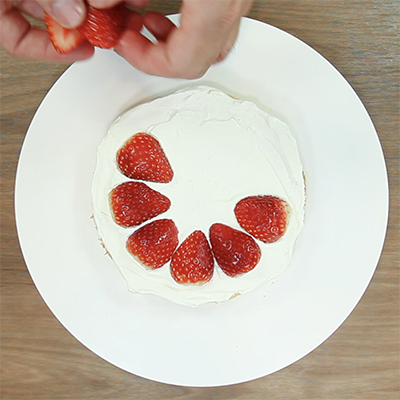 クリームを塗った所に1/2にカットしたイチゴを放射線状に並べます。 ※ケーキをきれいに切り分けるため、中心はあけておきます。