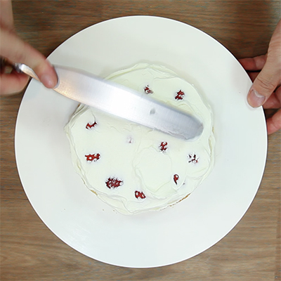 その上に生クリームをのせてイチゴが薄っすら見えるくらいの厚みまで生クリームを塗ります。
