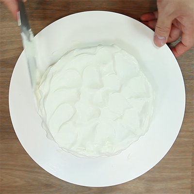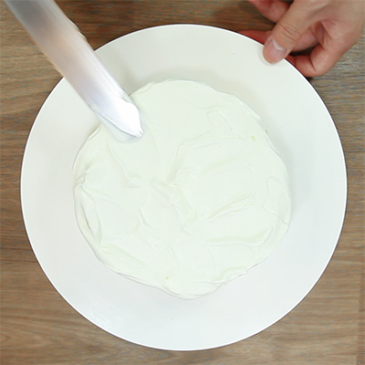 スポンジの上にクリームをのせてパレットナイフでペタペタと、模様がつくようにクリームを塗ります。※この時「塗る」よりはクリームを「くっつける」様なイメージです。