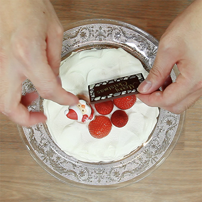 模様ができたら、上から粉砂糖をふりかけます。(ケーキに立体感がでます。) お好みのフルーツやクリスマスのオーナメントを飾ったら完成です。
