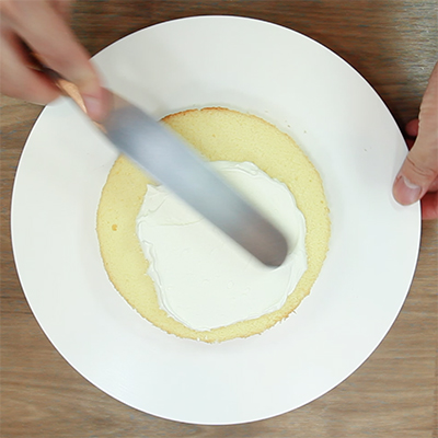 シロップを塗ったスポンジに先ほど泡だてた生クリームを約5㎜程度の厚さに塗ります。