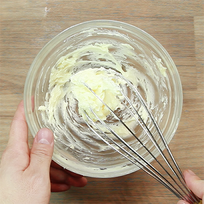 柔らかくしておいたバターに粉糖と塩を入れてゴムベラを使用し、ムラが無くなるまで混ぜ合わせる。