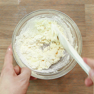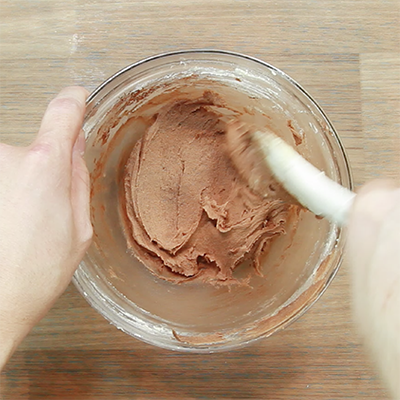 プレーンの生地と同様に生地を作り、ココアパウダーを加えゴムベラで粉っぽさが無くなるまで混ぜ合わせる。 -