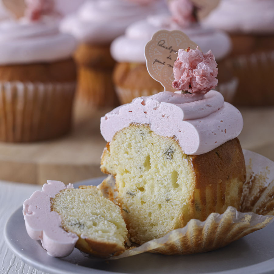 桜パウダーを使ったバタークリームをトッピングした桜のマフィン。